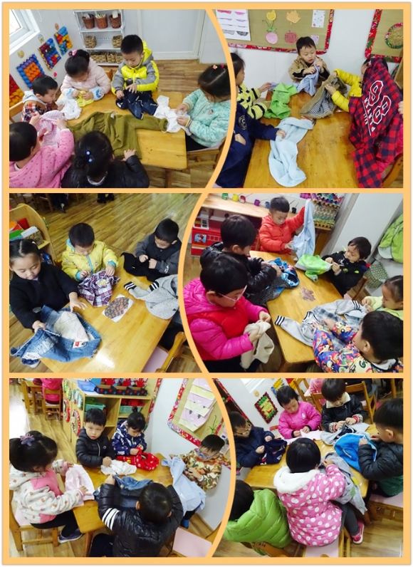 瞧,我们的星星宝贝在扣纽扣呢!他们多么认真呀!从最上面的纽扣开始扣。一只手的大拇指和食指捏住纽扣,另一只手的大拇指和食指拿起衣服上的扣眼,然后把纽扣从扣眼里穿过去。 我们的爸爸、妈妈在家中,也要鼓励幼儿做力所能及的事情,指导他们学习和掌握生活自理的方法,并对他们的尝试与努力给予鼓励。