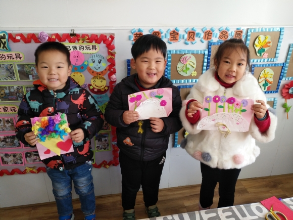 快乐的小天使艺术节活动进行中,今天苹果宝贝们用纸球和不织布做了许多美丽的小花,粘贴在彩色纸上,做成了一张张美丽的贺卡!瞧!很美吧!