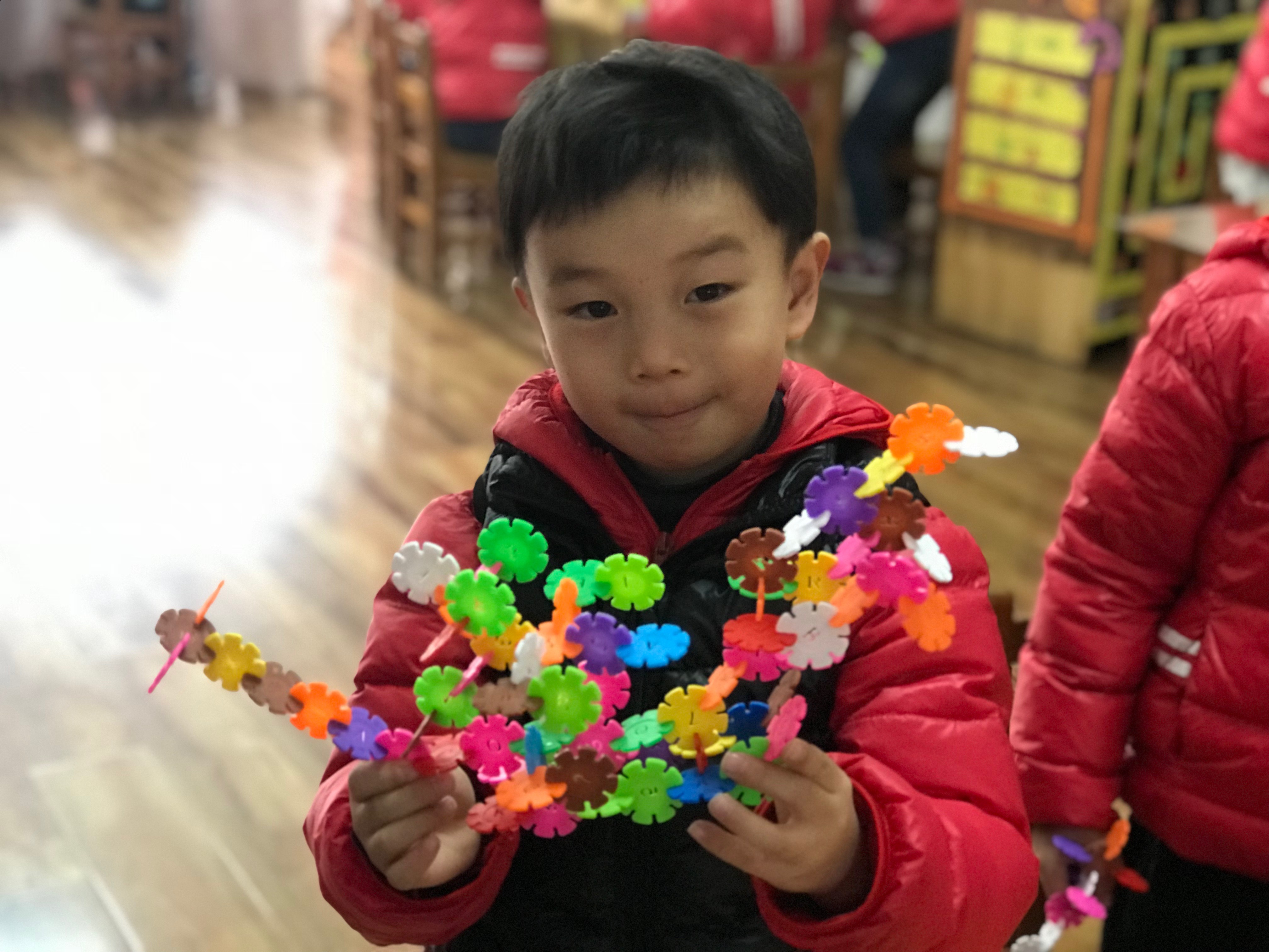 结构游戏是孩子们最喜爱的游戏之一,而在结构游戏中孩子们接触最多的就是雪花片了。雪花插片没有固定的模式,宝贝们可以根据自己的喜好拼插出物品、建筑物,运用“环形插”、“镭射插”、“十字插”、“球型插”等方法进行游戏。瞧,他们多认真呀!