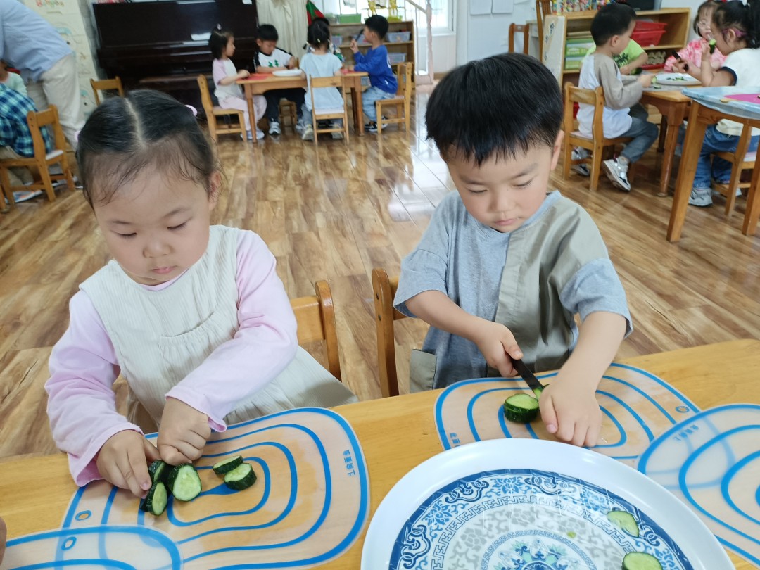 在《厨房小帮手》主题活动中,为了提高幼儿的动手能力和手眼协调能力,开展了一节生活活动“切”黄瓜,重点在“切”,怎么才能把硬硬的黄瓜切成小片呢?在师幼的讨论尝试下,宝贝们总结出了切黄瓜的方法:要想切黄瓜,手眼必协调,一下一下切黄瓜。(撰稿:郝梅芳 编辑:余亚南 审核:张辉)